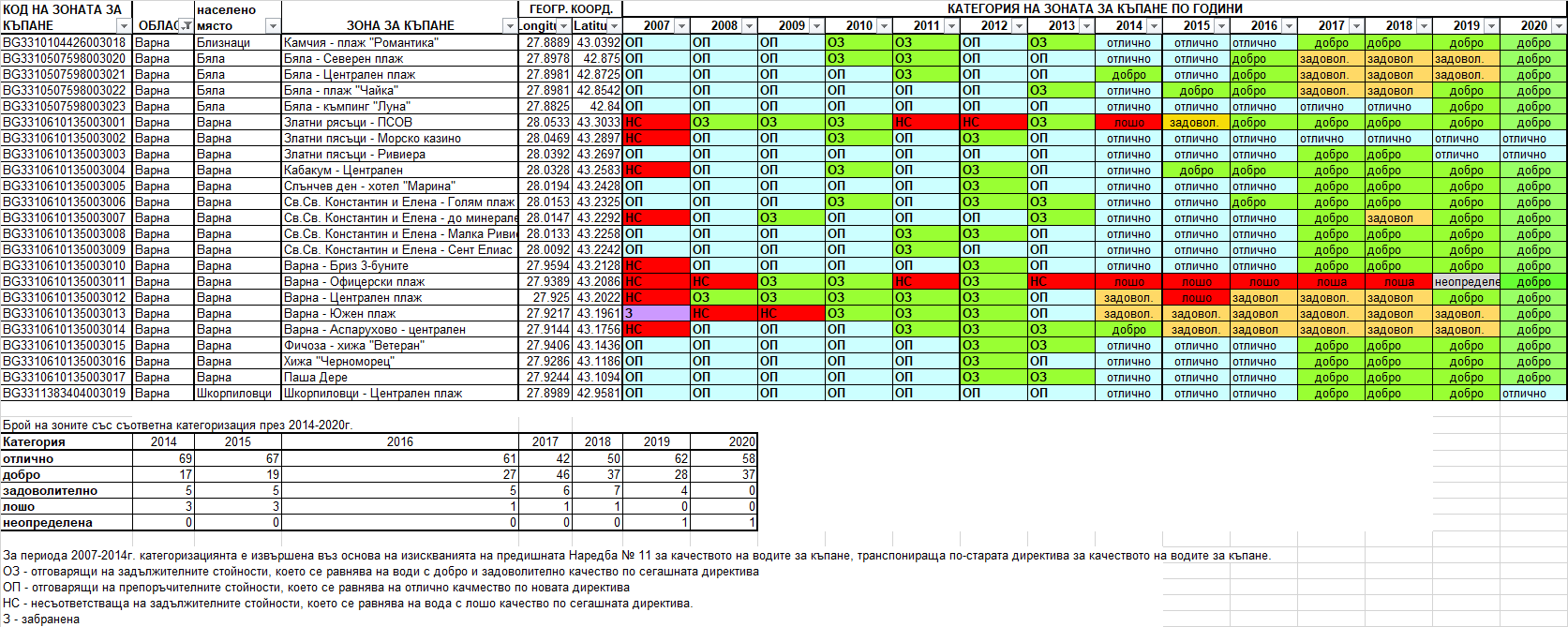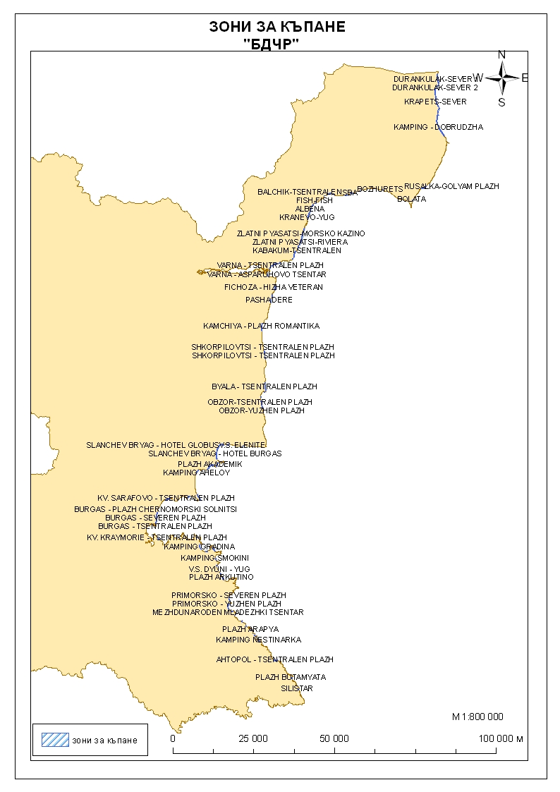 По Черноморското крайбрежие зоните за къпане са 90 на брой, а общо за страната са 94. Във всяка от тях има пункт за взимане на проби, с точно определени географски координати, които са включени в Информационната система по водите на Европейския съюз (WISE). През сезона за къпане се извършва пробовземане и анализ на водите, най-малко веднъж на две седмици от всяка една зона за къпане. В зависимост от местоположението на водите за къпане, началото на сезона започва в периода от 15 май до 30.06 юни и завършва в периода от 01 септември до 30 септември.