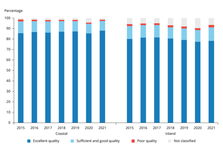 - Качеството на крайбрежните места като цяло е по-добро от това на вътрешните места . През 2021 г. 88,0% от крайбрежните места за къпане в ЕС са класифицирани като с отлично качество в сравнение със 78,2% от местата във вътрешността на страната.