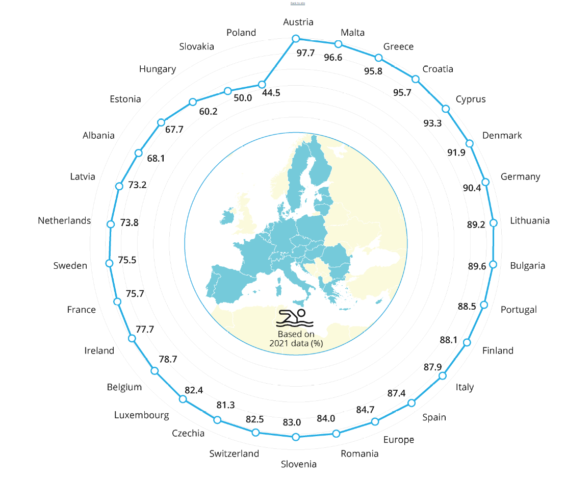 - Делът на отличните води за къпане е стабилен през последните години. В периода 2015-2021 г. делът на водите за къпане с отлично състояние в Европа е стабилен на 85-88% за крайбрежните води за къпане; и 77-81% за вътрешни води за къпане.