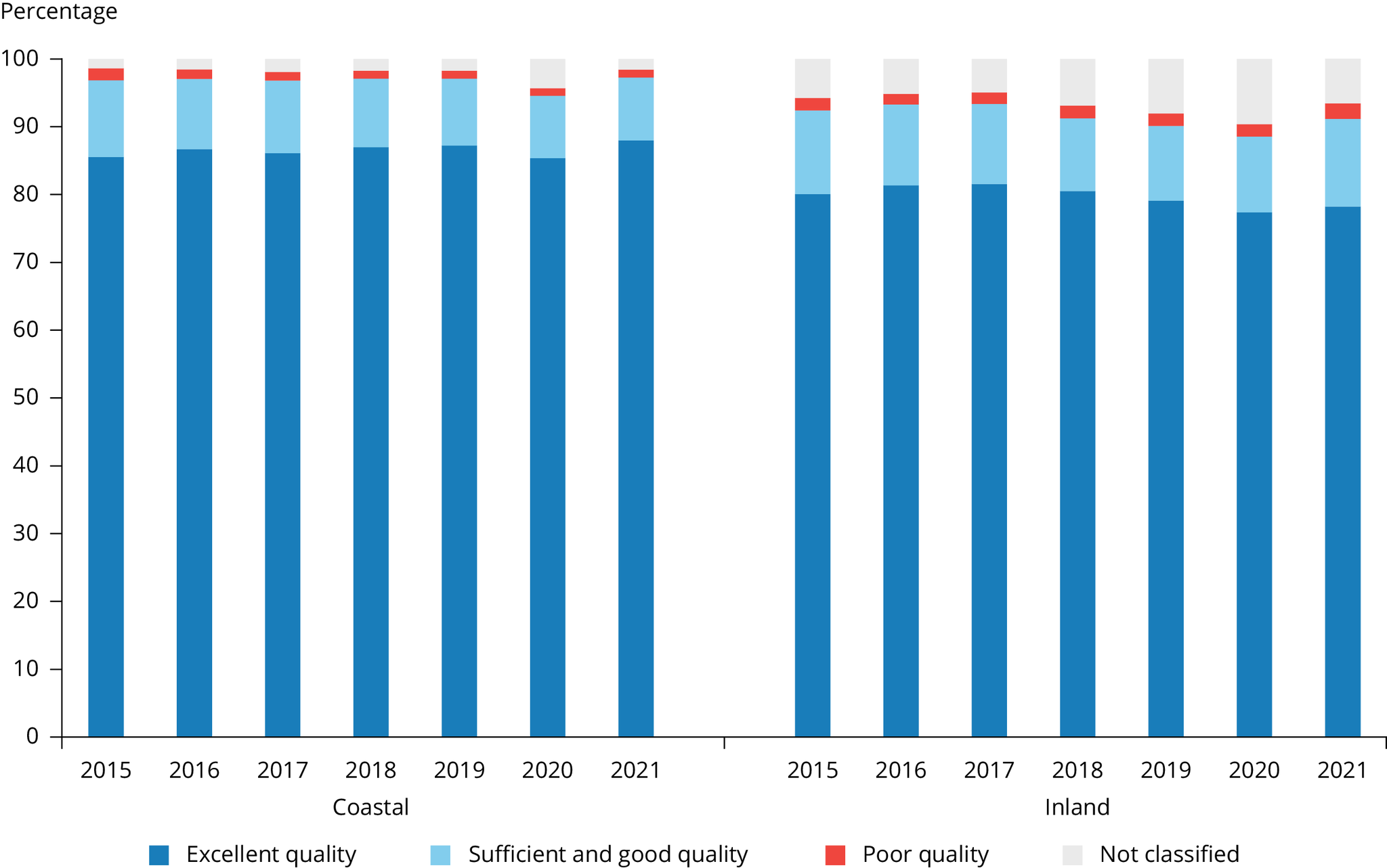 В периода 2015-2021 г. делът на водите за къпане с отлично състояние в Европа е стабилен на 85-88% за крайбрежните води за къпане; и при 77-81% за вътрешните води за къпане. Качеството на крайбрежните зони обикновено е по-добро от това на вътрешните зони поради по-високия капацитет за самопречистване на крайбрежните зони. Нещо повече, много централноевропейски вътрешни водни обекти за къпане са разположени на сравнително малки езера и езера, както и на реки с малък отток, които, особено през лятото, са по-податливи от крайбрежните зони на краткотрайно замърсяване, причинено от обилни летни дъждове или засушавания.